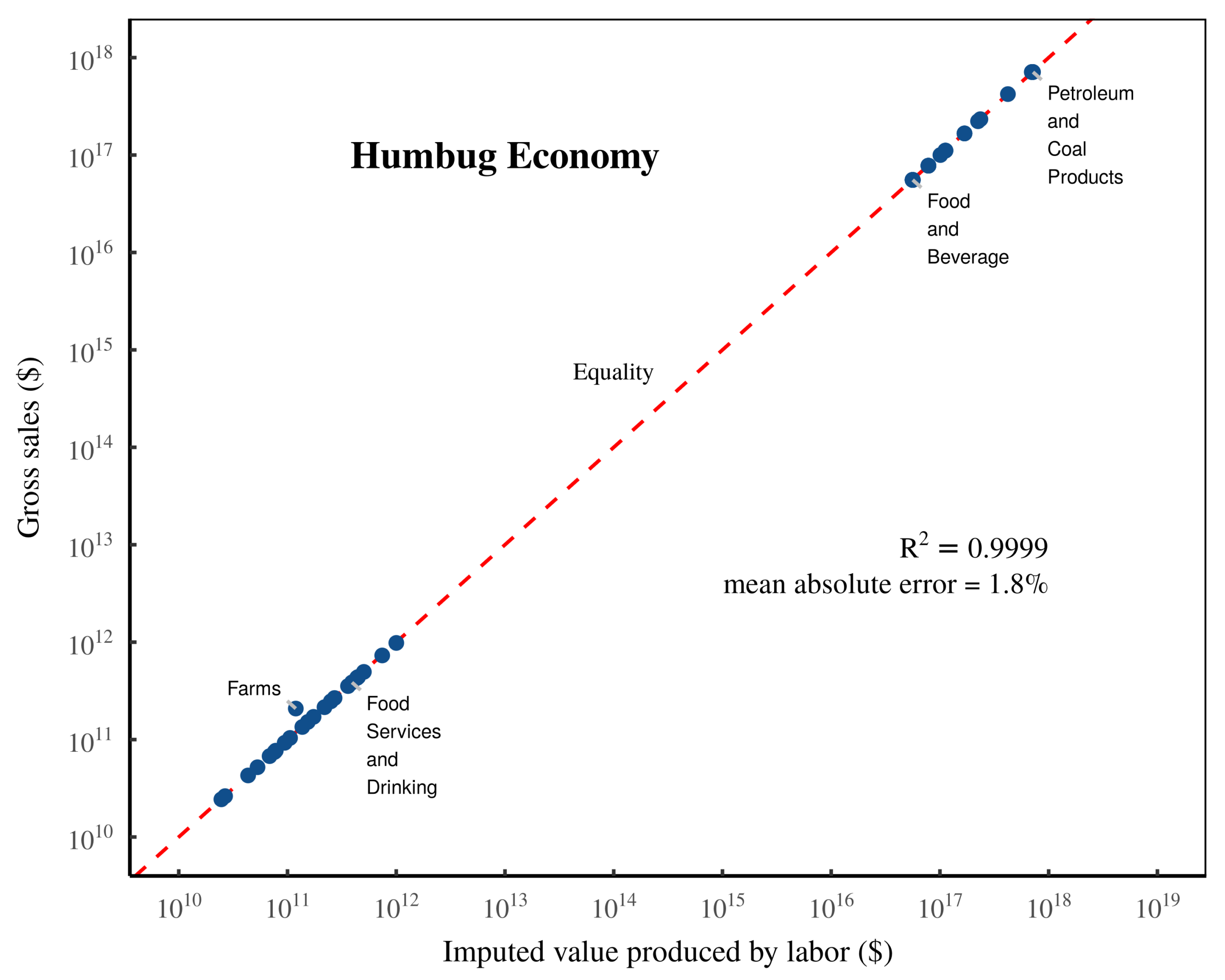 Sabatino’s paper takes aim at Anwar Shaikh’s method for ‘testing’ the labor theory of value. The backstory behind Sabatino’s work is that in 1974, Shaikh published a devastating critique of the neoclassical theory of economic growth. Shaikh demonstrated that under the condition that the labor share of income is fairly constant over time, the Cobb-Douglas production function reduced to an accounting identity, defined by the bookkeeping rules within the national accounts (Shaikh, 1974). To demonstrate this principle, Shaikh showed that the Cobb-Douglas function ‘worked’ when fed nonsense data that spelled the word ‘HUMBUG’.