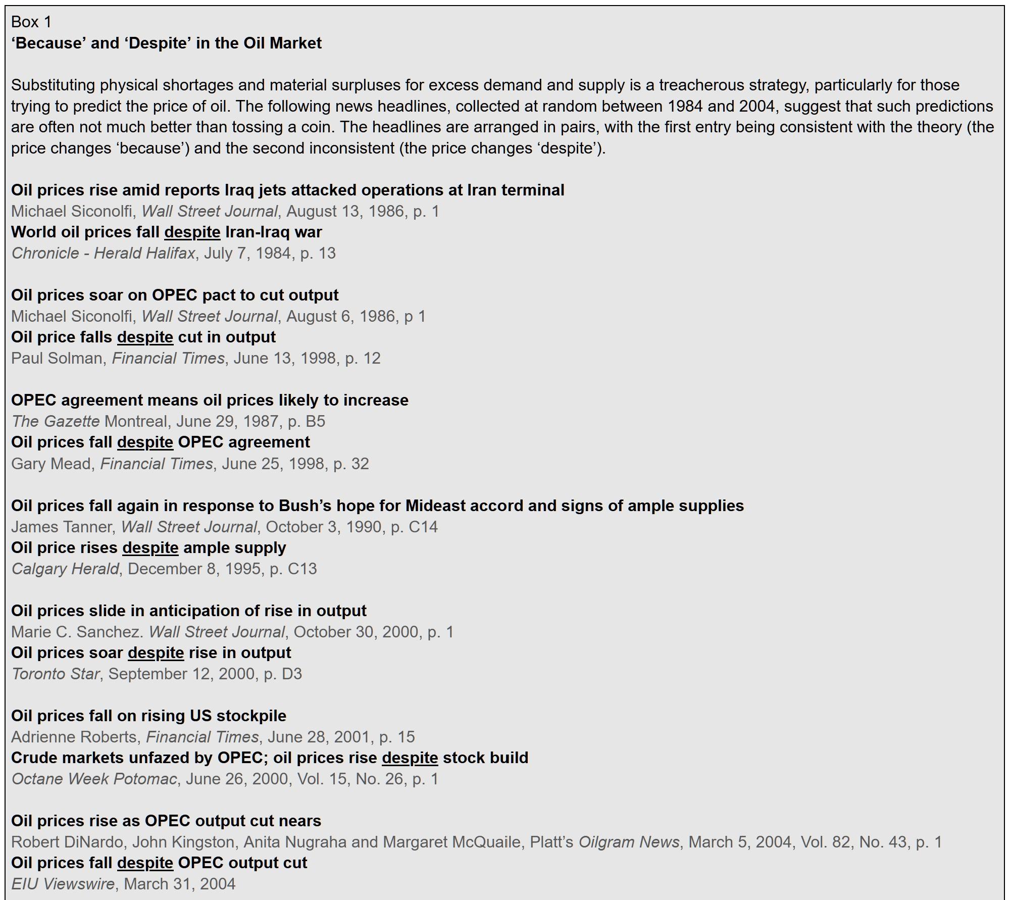 E. Using this perspective, we discovered in the late 1980 and early 1990s a rather systematic relation between the differential profits of the large oil companies and exports of OPEC on the one hand and relative oil prices on the other, and we showed that their historical ups and downs have been closely connected with Middle East energy conflicts.